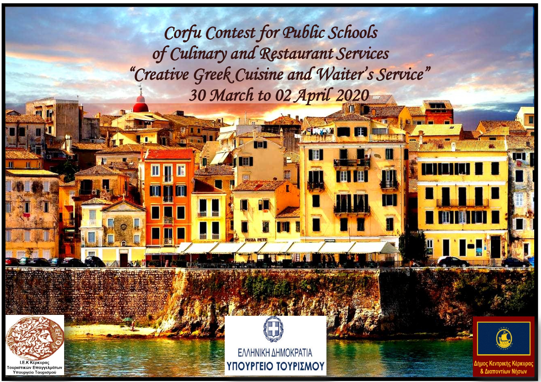Από 30 Μαρτίου έως 2 Απριλίου 2020 θα πραγματοποιηθεί στο Εκπαιδευτήριο του Ι.Ε.Κ Κέρκυρας Πανευρωπαϊκός Διαγωνισμός Ελληνικής δημιουργικής κουζίνας και σερβιρίσματος υπό την αιγίδα του Υπουργείου Τουρισμού.